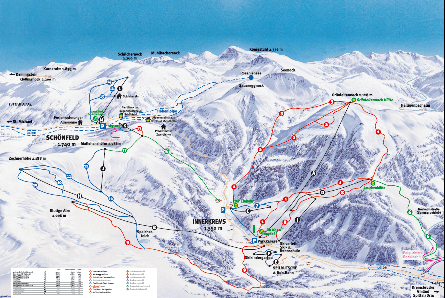 Im Herbst 2022 wurde die Investoren-Initiative Alpenjuwel Nockalm ins Leben gerufen. Wir gehen aktuell allerdings davon aus, dass dieses Projekt im kommenden Winter noch nicht umgesetzt und das Skigebiet Innerkrems weiterhin geschlossen sein wird. Die am nächsten gelegenen Skigebiete sind Katschberg (30 Min. Fahrzeit) und Grosseck-Speiereck (35 Minuten Fahrzeit).